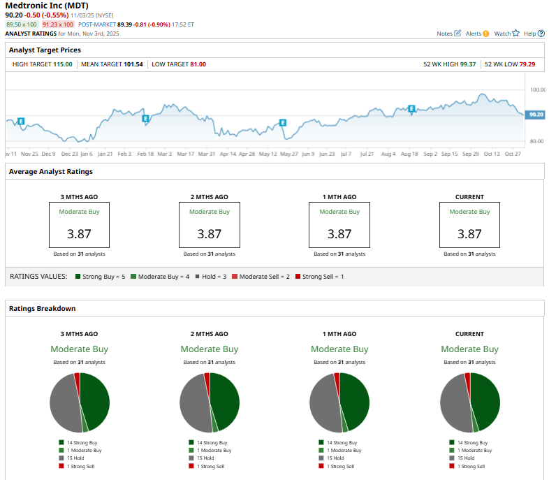Among 31 analysts covering MDT stock, the consensus rating is a "Moderate Buy," comprising 14 "Strong Buy" ratings, one "Moderate Buy," 15 "Holds," and one “Strong Sell.”