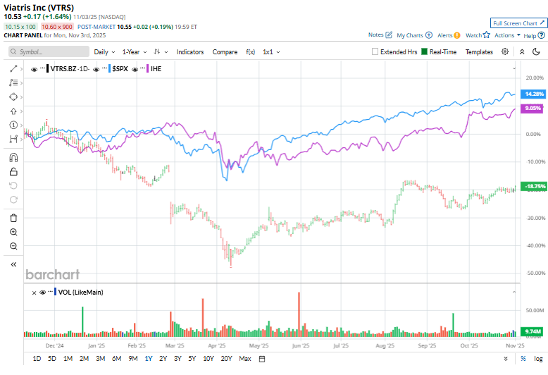 Looking more closely, VTRS has also trailed the iShares U.S. Pharmaceuticals ETF (IHE), which has surged 10.8% over the past year and 16.2% on a YTD basis.