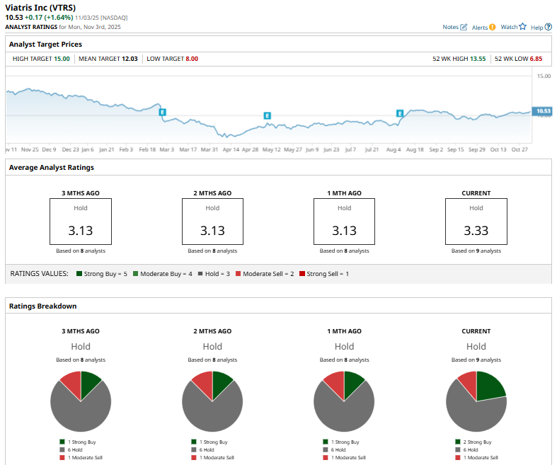 Among the nine analysts covering VTRS stock, the consensus is a “Hold.” That’s based on two “Strong Buy” ratings, six “Holds,” and one “Moderate Sell.”