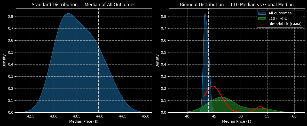 Looking at risk topography — a three-dimensional view of demand structure — trial frequency is concentrated between $44 and $48. This dynamic places the breakeven price near the concentration of activity, which gives it a higher likelihood of breaking even. However, the second leg of the trade stretches so that it can attempt to grab the upper price realms without incurring an opportunity cost.