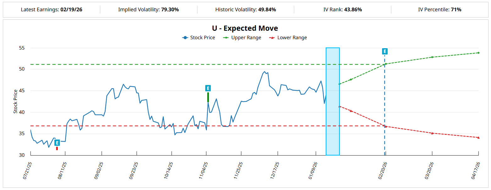 Another factor to consider is the Expected Move calculator. Using a variant of the Black-Scholes model and integrated with the appropriate implied volatility (IV) data, U stock would be anticipated to land between $36.71 and $51.25 (a spread of 16.52%) on the Feb. 20 expiration date.