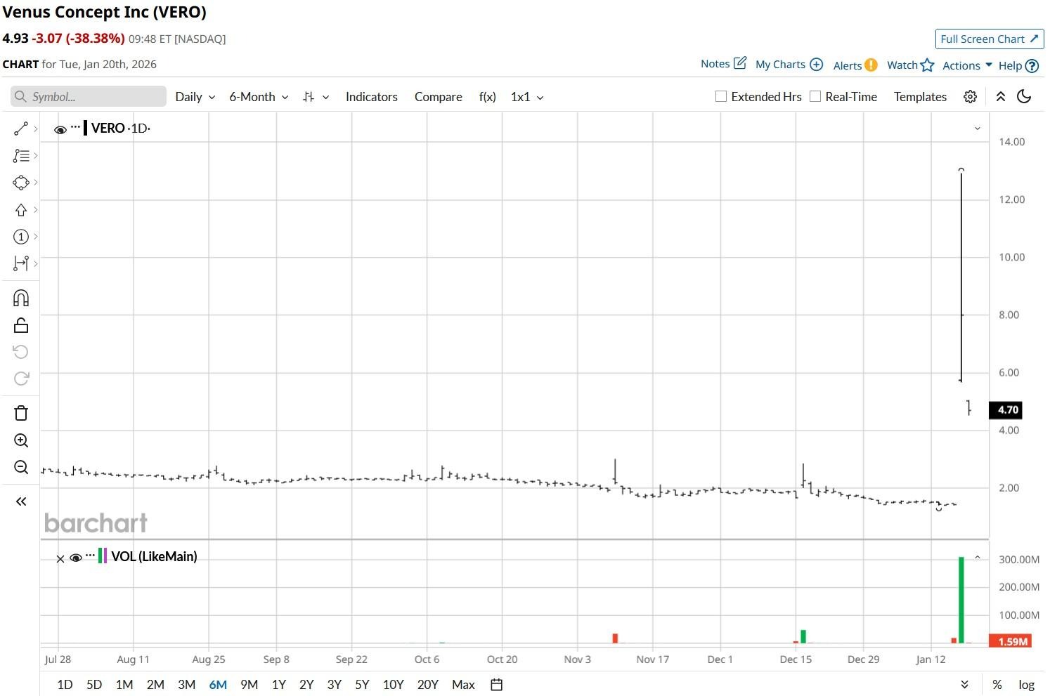 Venus Concept (VERO) shares gained nearly 460% on Jan. 16 after Madryn Asset Management disclosed a 91% ownership stake in the medical aesthetic technology company.