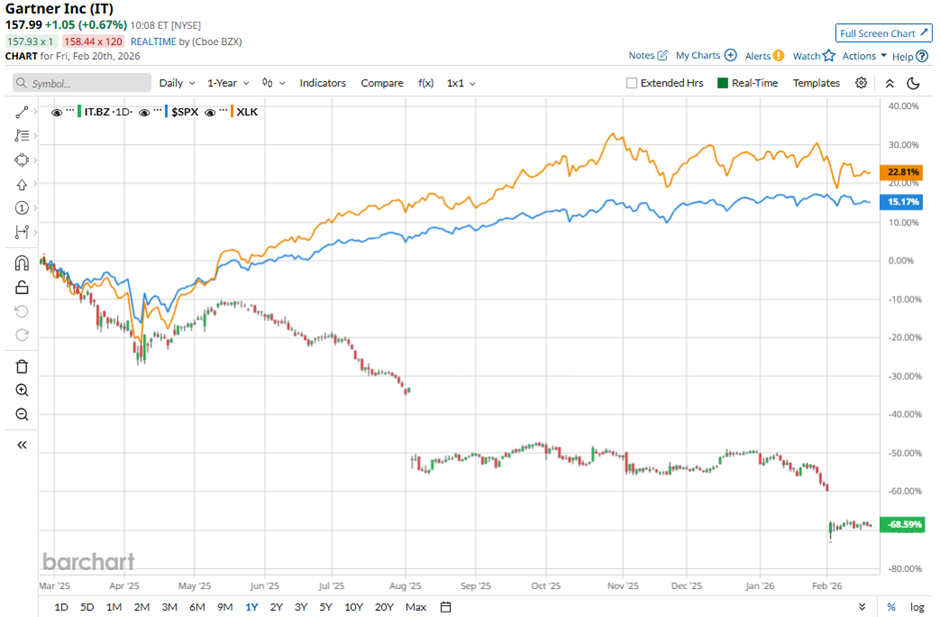 Shares of Gartner tumbled 20.9% on Feb. 3 as Q4 2025 net income fell 39% year-over-year to $242 million and EPS dipped 34% to $3.36. Full-year 2025 results deepened concerns, as net income declined 42% to $700 million and EPS fell 40% to $9.65. The sell-off was compounded by deteriorating cash generation, with operating cash flow down 13% to $1.3 billion and free cash flow falling 15% to $1.2 billion, overshadowing management’s optimistic outlook for 2026.