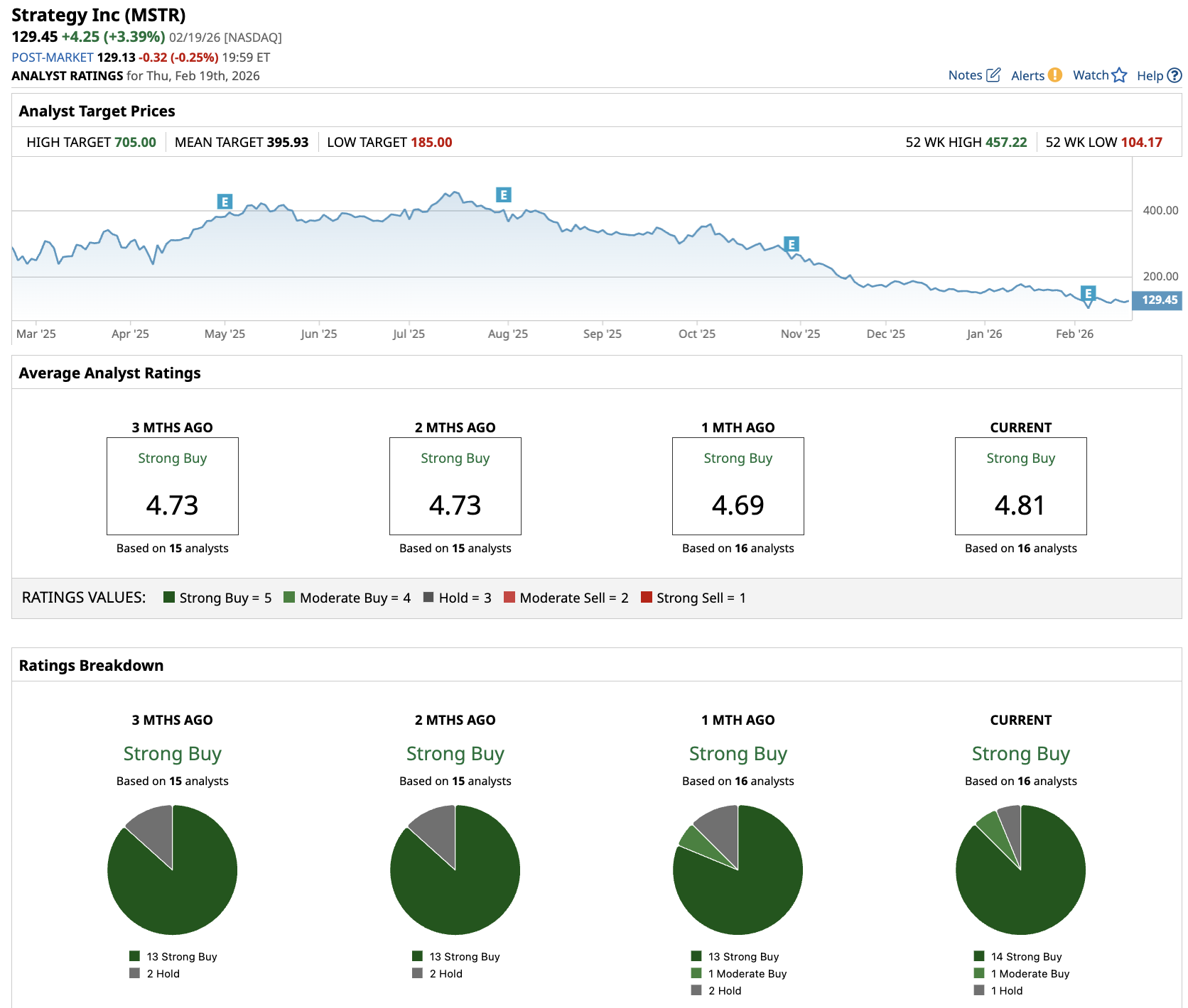 Out of the 16 analysts covering MSTR stock, 14 recommend “Strong Buy,” one recommends “Moderate Buy,” and one recommends “Hold.” The average MSTR stock price target is $396, above the current price of $129.