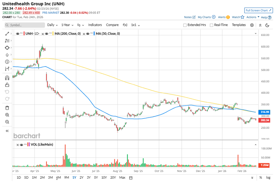 To confirm the bearish trend, UNH has been trading below its 50-day moving average since late October, 2025, with slight fluctuations. The stock has been trading below its 200-day moving average over the past year, with slight fluctuations.