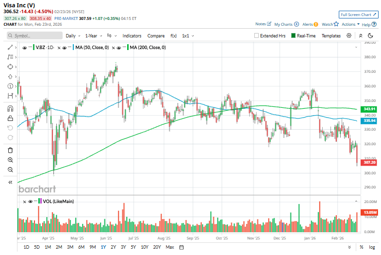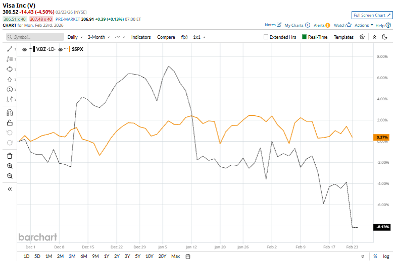On Feb. 23, Visa shares fell more than 4%, underperforming alongside other payment and delivery stocks after Citrini Research outlined a hypothetical AI-driven disruption scenario for the global economy. The note weighed on sentiment toward transaction-linked financial platforms, with investors rotating out of the group amid concerns that rapid AI adoption could reshape payment ecosystems and competitive dynamics.