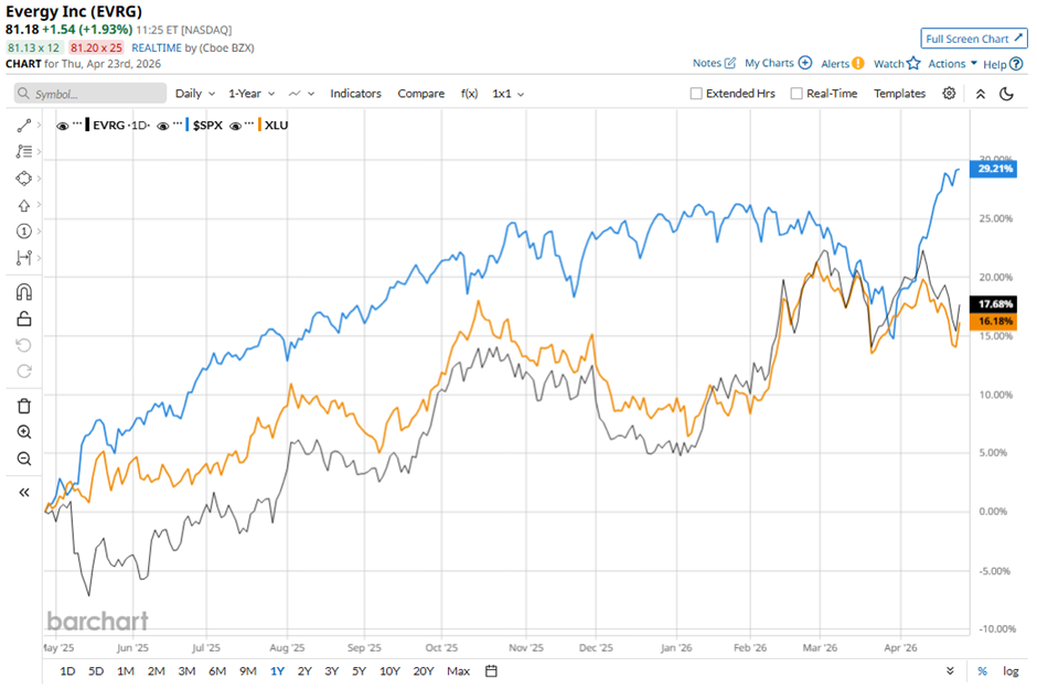 EVRG stock has risen 19.4% over the past 52 weeks, underperforming the S&P 500 Index's ($SPX) 32.8% gain. However, the stock has outpaced the State Street Utilities Select Sector SPDR ETF's (XLU) 16.8% increase over the same period.