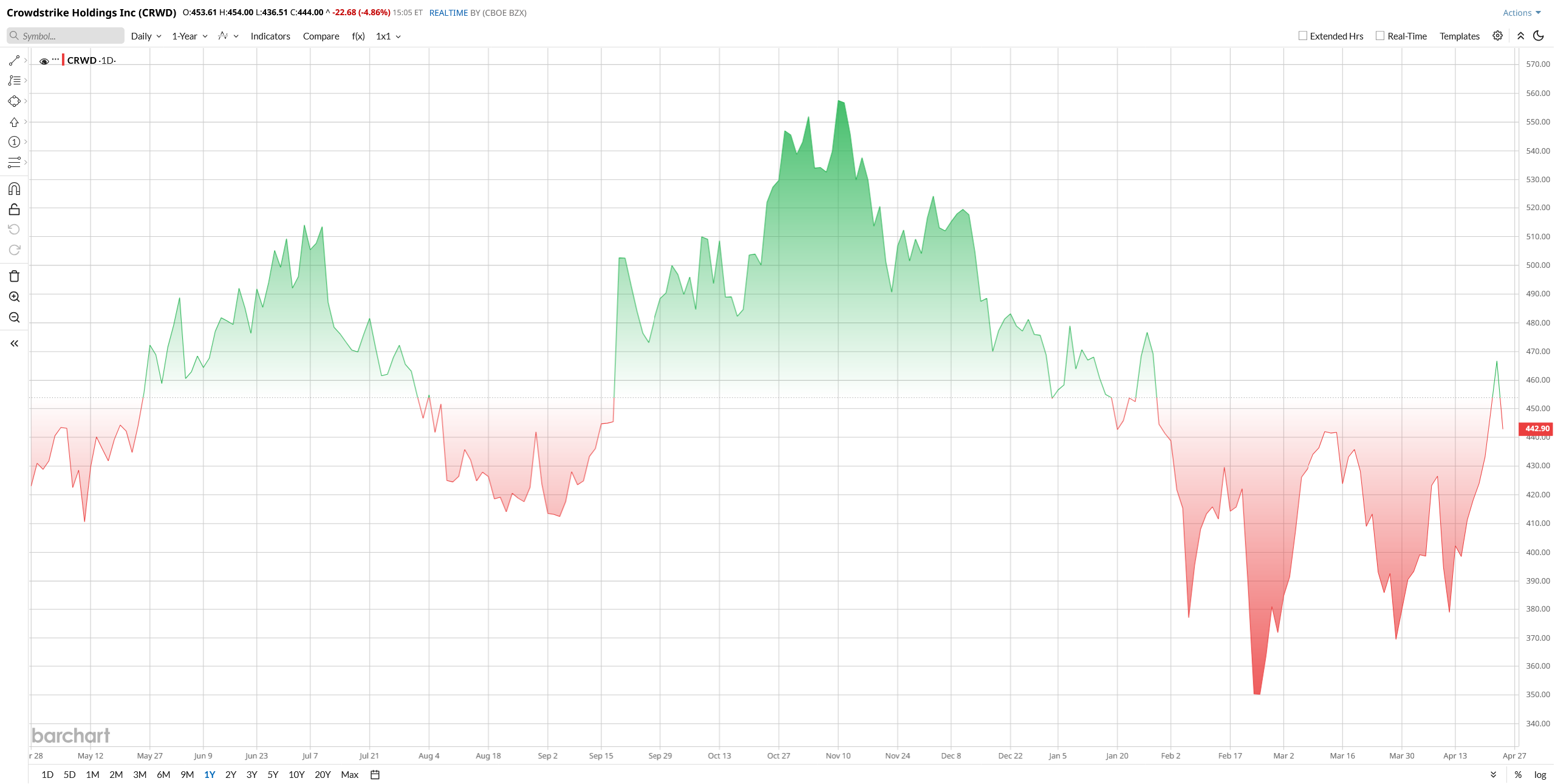 Guidance also came in above expectations. For the fiscal first quarter of 2027, CrowdStrike guided revenue to $1.36 billion to $1.364 billion and adjusted EPS to $1.06 to $1.07. For fiscal 2027, it guided revenue to $5.87 billion to $5.93 billion and adjusted EPS to $4.78 to $4.90. Barchart’s earnings page shows the Street looking for full-year fiscal 2027 EPS of $1.01.