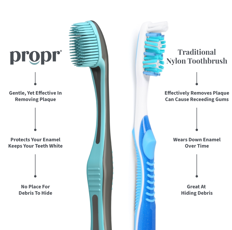 Motivated to solve this problem, Dr. Gruber developed the Propr Brush, a purpose-built toothbrush that replaces traditional nylon bristles with Medical Grade TPE (thermoplastic elastomer) super-soft scrubbers. These scrubbers are designed to gently remove plaque while minimizing irritation and trauma to teeth and gums, supporting healthier tissue and long-term oral wellness.