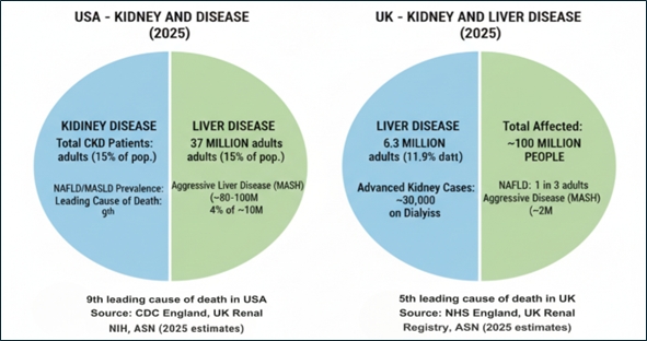 This infographic provides a comparative overview of kidney and liver disease statistics for the USA and the UK, based on 2025 estimates.