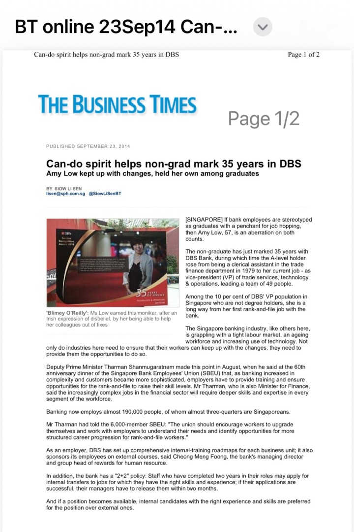 Amy Low featured in the Business Times celebrating 35 years of service in 2014.
