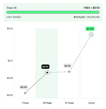 At this moment, NEX presale is in stage 28 and has raised over $11M, priced at $0.112.