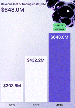 On October 24th, Kraken reported financial results that exceeded expectations, with $648M in revenue for Q3 2025. Just for comparison, this represents a 114% year-over-year increase (its last best performance in history).