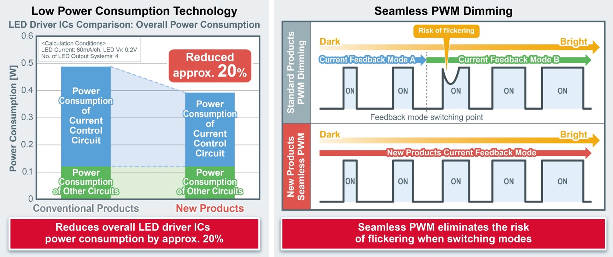 Conventional LED drivers that consume relatively large amounts of power are susceptible to flickering during PWM dimming. In contrast, ROHM has developed LED drivers for LCD backlights that combine proprietary low power technology with seamless PWM dimming. This eliminates flickering when changing the display brightness from low to high.