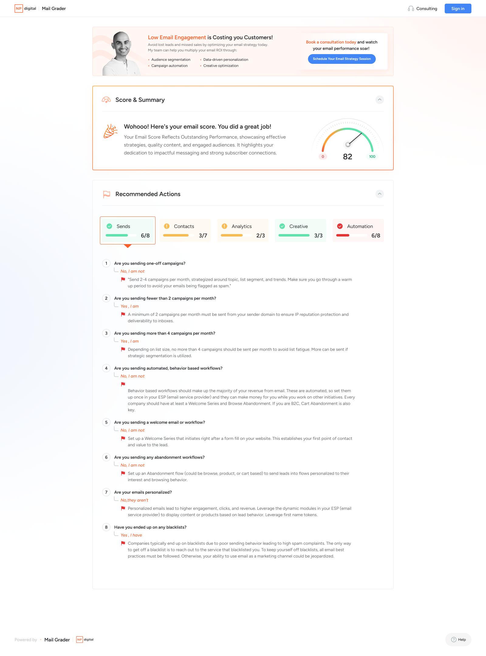 Users answer a series of questions, and within a few minutes, the tool populates an overall 1-to-100 grade of their email strategies and advises actions to improve in each of the five areas. The Mail Grader report is an educational asset that prescribes effective strategies to maximize email return on investment (ROI). It explains why each element is critical to campaign success and the impact of missed opportunities.