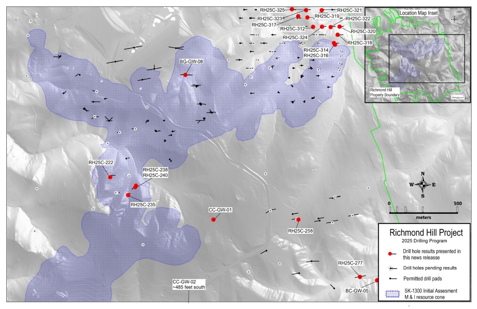 - Richmond Hill expansion drill holes RH25C-319 intersected 1.18 grams per tonne gold (g/t Au) over 47.6 meters (56 gram meters) and RH25C-323 intersected 2.19 g/t Au over 31.1 meters (68 gram meters), including 17.35 g/t Au over 1.5 meters (26 gram meters). RH25C-323 is the furthest step-out hole drilled to date on the Project and is 200 meters (660 feet) north of the current measured and indicated resource boundary, and 305 meters (1,000 feet) north of gold mineralization that drove the pit boundary. Several adjacent holes are awaiting assay results and will be received in the coming weeks. The mineralization in the northeast is only limited by drilling and remains open. The 2025 drill program covers an area of 300 meters (980 ft) north - south and 535 meters (1,750 ft) east - west.
