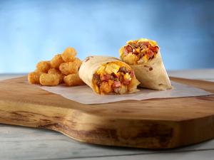 Triple Meat Locker Burrito: This meaty sensation is packed with Applewood smoked bacon, savory country sausage, tender diced ham, farm-fresh scrambled eggs, crispy tater tots, and melted cheddar cheese.