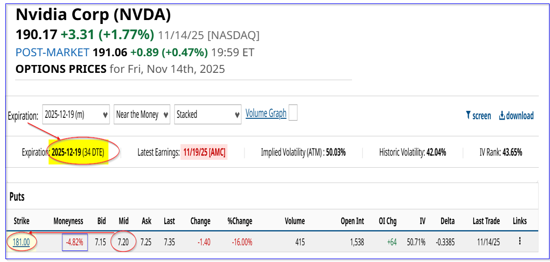 A week ago, I suggested shorting the $170 put option expiring Dec. 12, 2025, for a premium of $4.60. That represented a one-month short-put yield of 2.71% (i.e., $4.60/$170.00) for a 9.7% out-of-the-money (OTM) put.