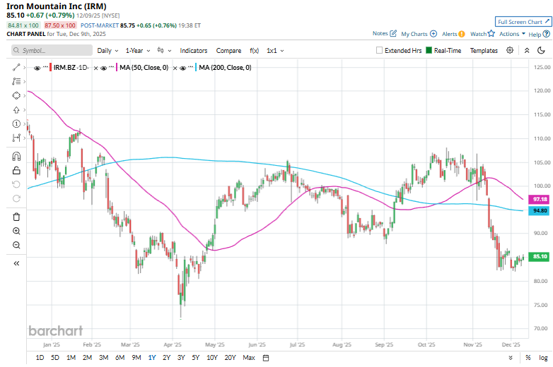 IRM stock has been trading below its 50-day and 200-day moving averages since early mid-November, establishing a downtrend.