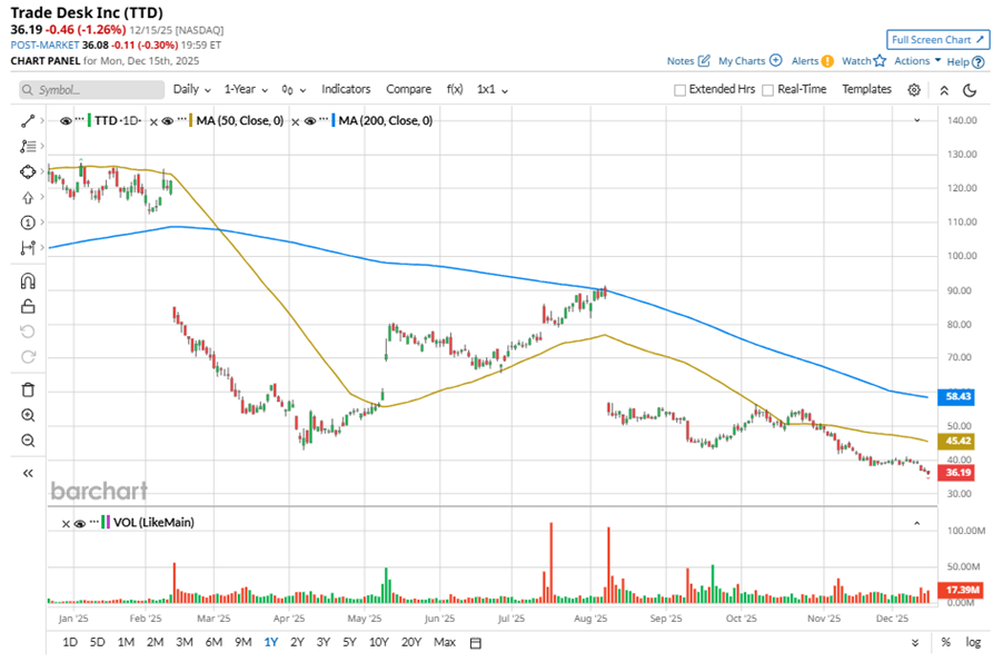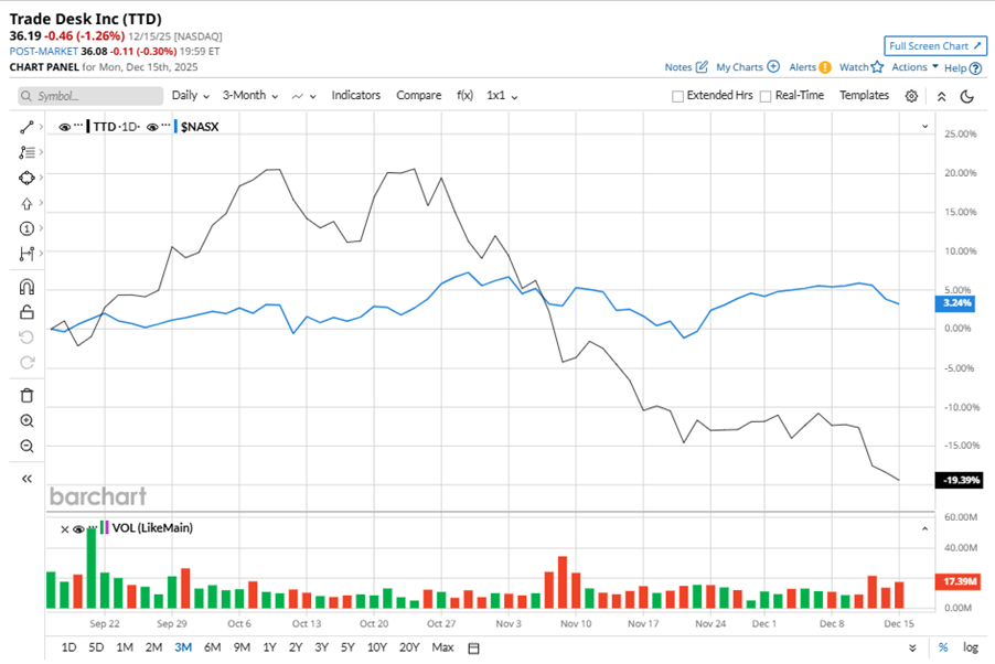 Despite its notable strength, TTD slipped 74.4% from its 52-week high of $141.53, achieved on Dec. 4, 2024. Over the past three months, TTD stock has declined 20.5%, underperforming the Nasdaq Composite’s ($NASX) 3.2% gains during the same time frame.