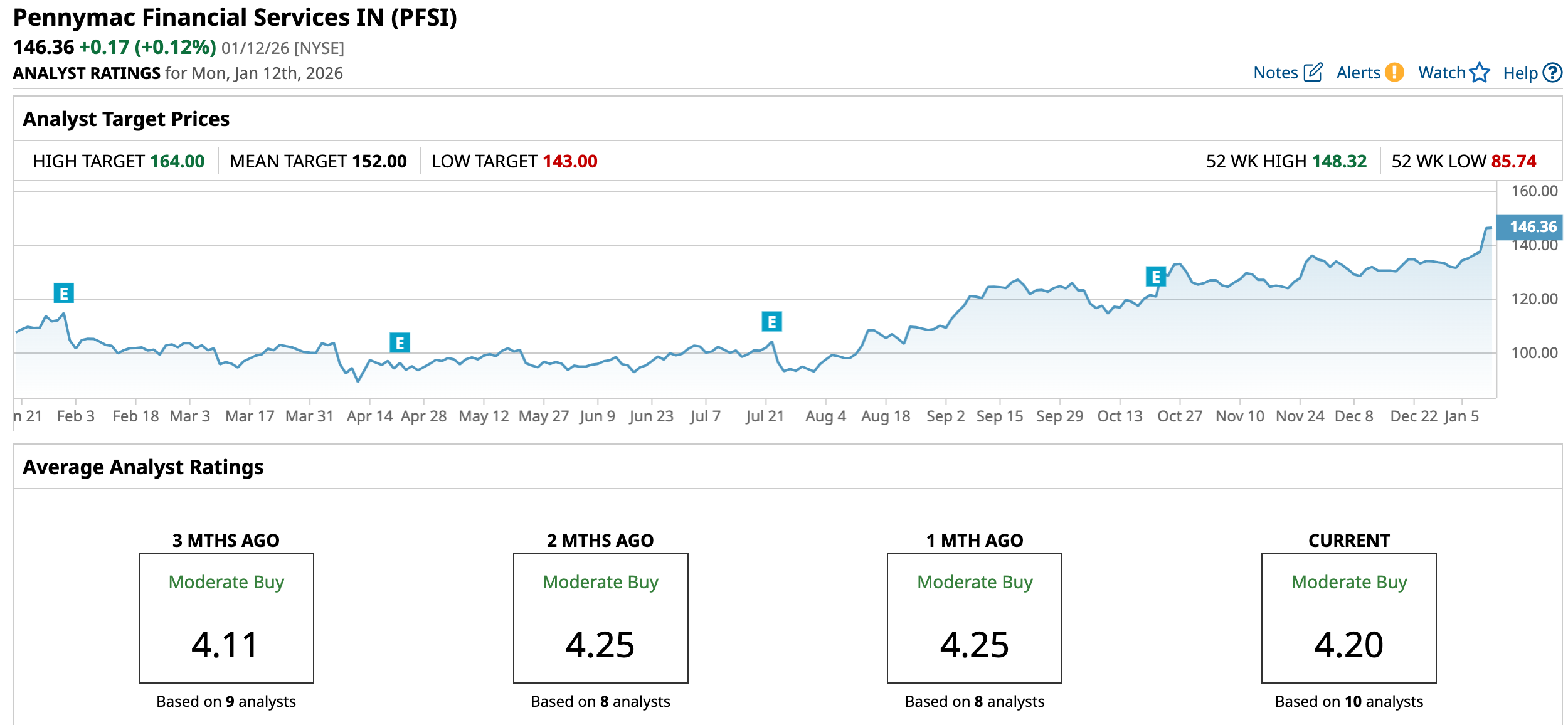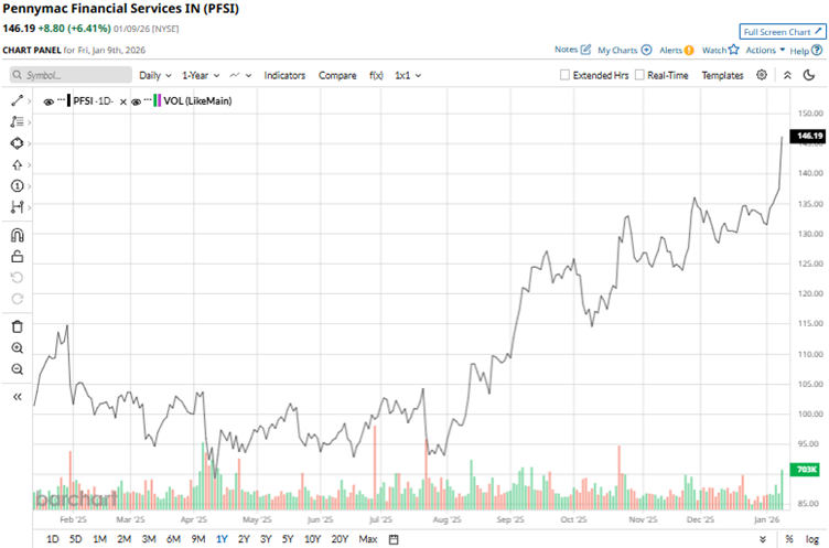 Lower rates boosted mortgage originations and servicing, with the stock outperforming broader indices amid artificial intelligence (AI) integration and steady dividends. Over the past 52 weeks, PennyMac’s stock has gained 52%, while it has been up 46.27% over the past six months. It reached a 52-week high of $146.68 on Jan. 9, following President Trump’s announcement, and is down marginally from that level. Over the past five days, the stock has risen 9%.