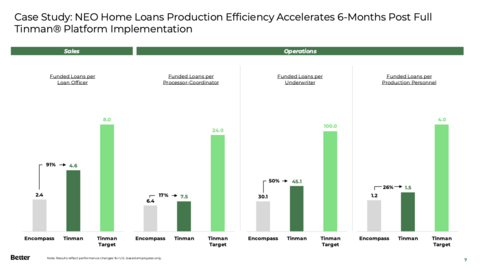 The NEO powered by Better collaboration highlights strong production efficiency and cost gains from 2024 to 2025 after switching from Encompass to Tinman AI Platform