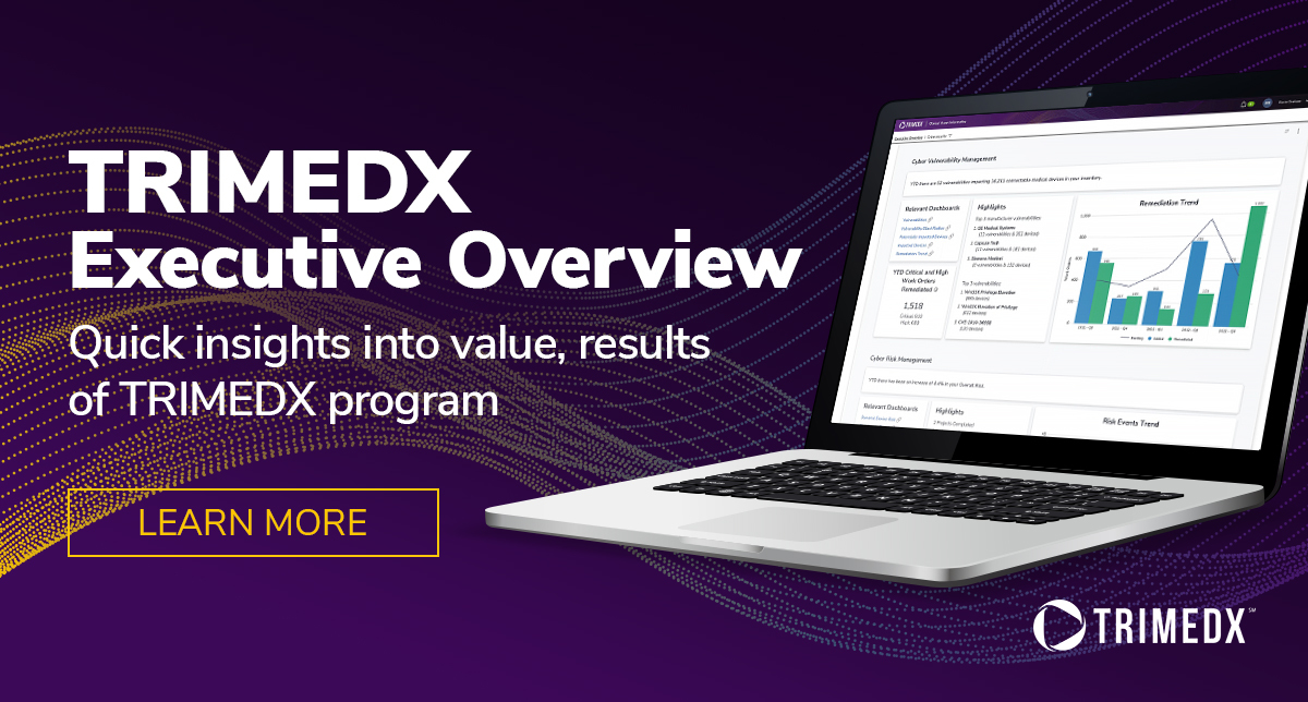Indianapolis, Indiana, April 25, 2023 (GLOBE NEWSWIRE) -- TRIMEDX, an industry-leading, technology-enabled provider of clinical engineering, medical device cybersecurity, and clinical asset management solutions, announced the release of its new Executive Overview. This unique Clinical Asset Informatics user experience provides clinical and operational leaders quick insights into patient safety through regulatory & cybersecurity excellence, clinical asset utilization & availability, clinical engineering program performance, and financial savings.
