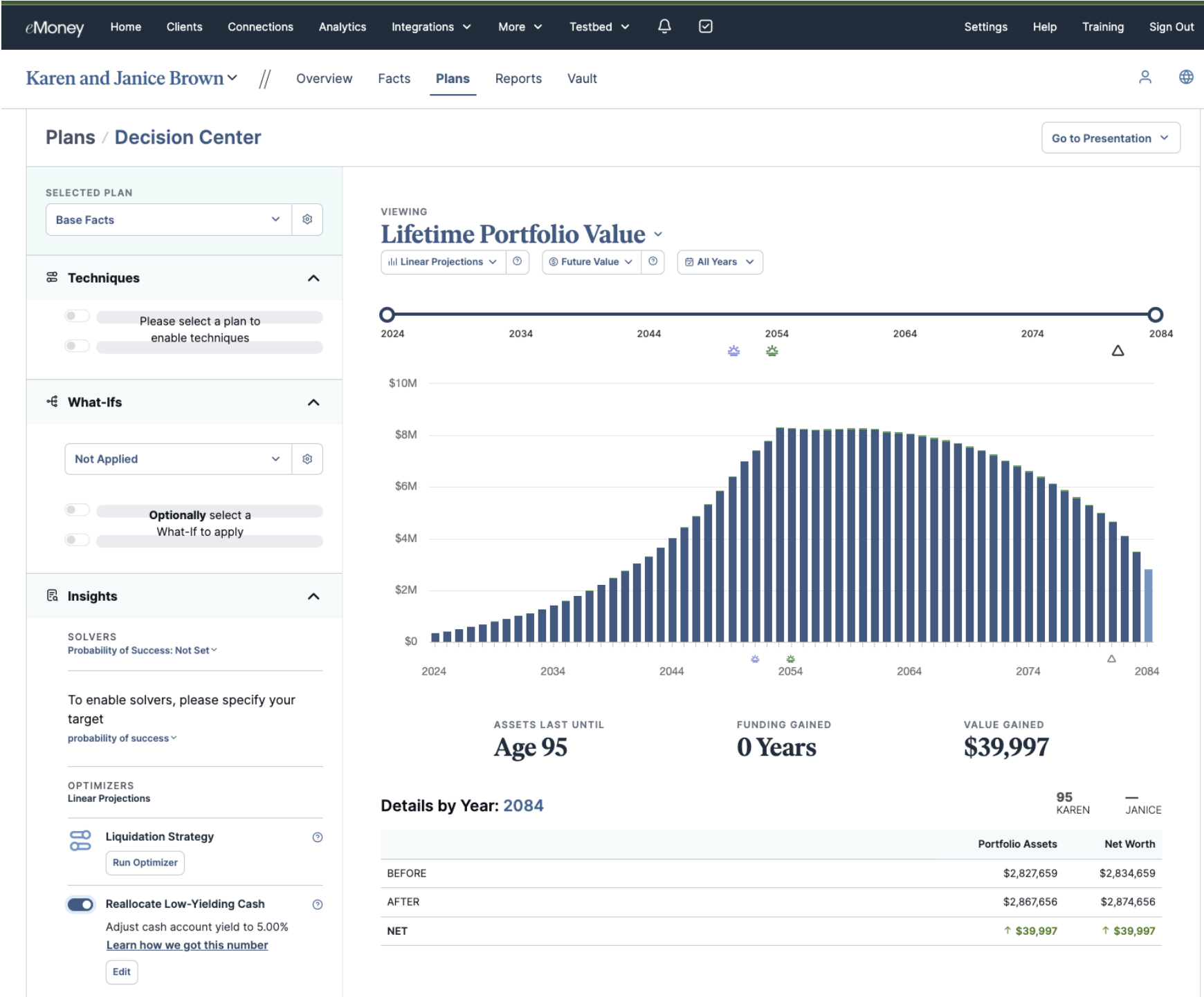 Building on the existing direct data feed that is currently in use by hundreds of advisors, the enhanced partnership now allows advisors on eMoney, who choose to leverage the new integration, to see and model clients’ held away cash and demonstrate the impact of moving cash from low-yielding accounts to competitive rate accounts at Flourish directly in Decision Center. This interactive modeling capability lets advisors show live projections of the effect of cash on the portfolio over time. After showing clients the value of optimizing their cash holdings, advisors can pre-fill and send Flourish Cash invitations from within eMoney.