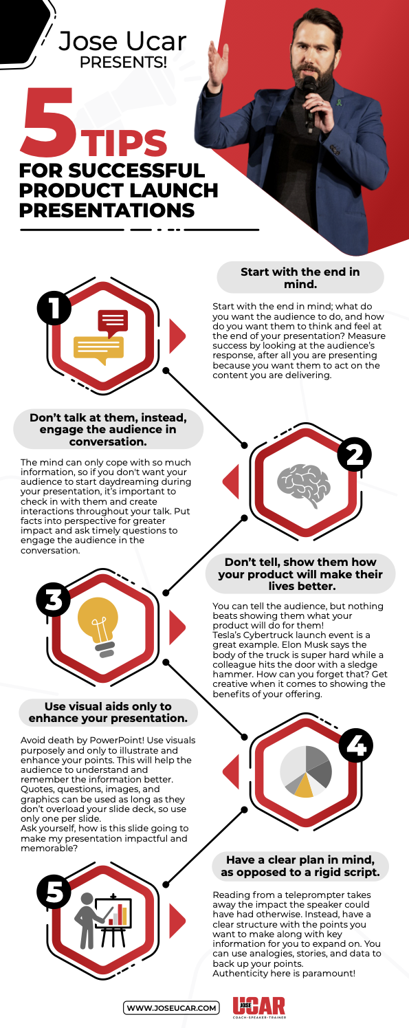 Jose Ucar, founder of Jose Ucar Coaching, announces today the release of an infographic that details his top 5 tips for a successful product launch presentation.
